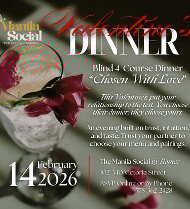 Celebrate love with a fun intimate evening at Manila Social paired with a special 4-Course Dinner by Romeo and optional crafted pairings by Narain to spark the romance